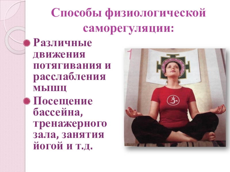Способы физиологической саморегуляции:Различные движения потягивания и расслабления мышцПосещение бассейна, тренажерного зала, занятия йогой и т.д.