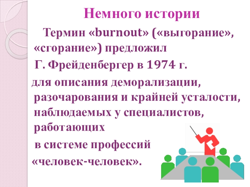 Немного истории Термин «burnout» («выгорание», «сгорание») предложил Г. Фрейденбергер в 1974 г. для описания деморализации, разочарования и крайней усталости, наблюдаемых у специалистов, работающих в системе профессий «человек-человек».