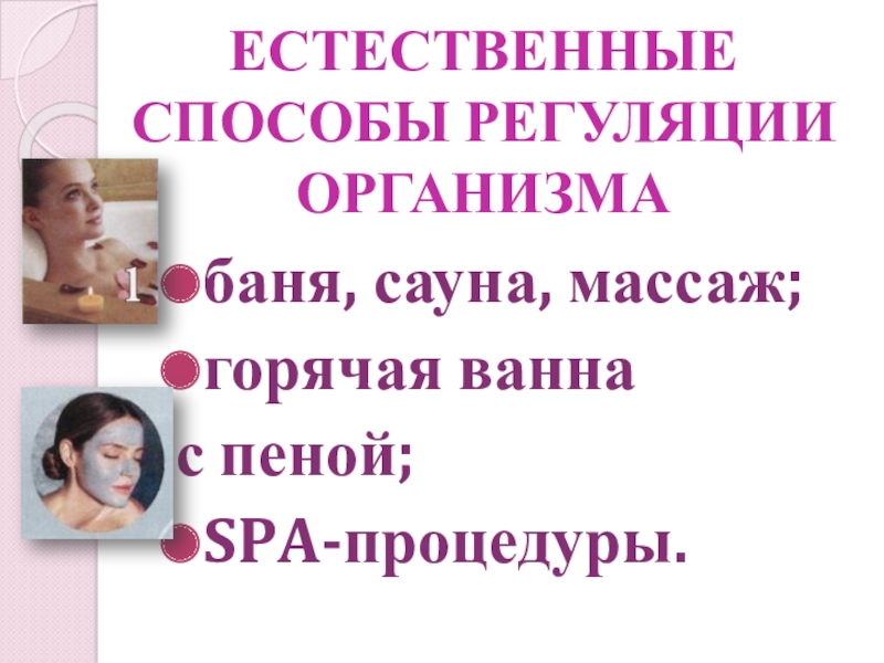ЕСТЕСТВЕННЫЕ СПОСОБЫ РЕГУЛЯЦИИ ОРГАНИЗМАбаня, сауна, массаж;горячая ванна с пеной; SPA-процедуры.