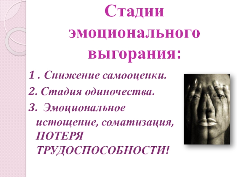 Стадии эмоционального выгорания:1 . Снижение самооценки.2. Стадия одиночества.3. Эмоциональное истощение, соматизация, ПОТЕРЯ ТРУДОСПОСОБНОСТИ!