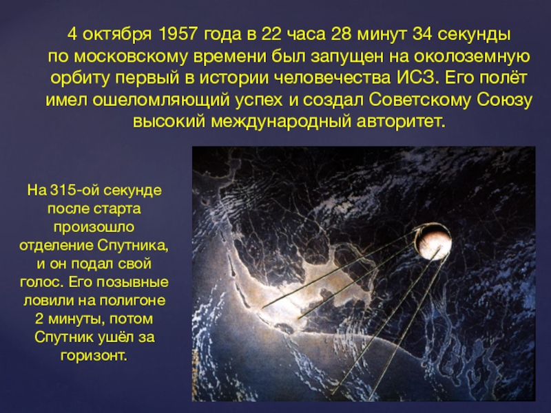 На 315-ой секунде после старта произошло отделение Спутника, и он подал свой голос. Его позывные ловили на полигоне 2 минуты, потом Спутник ушёл за горизонт.