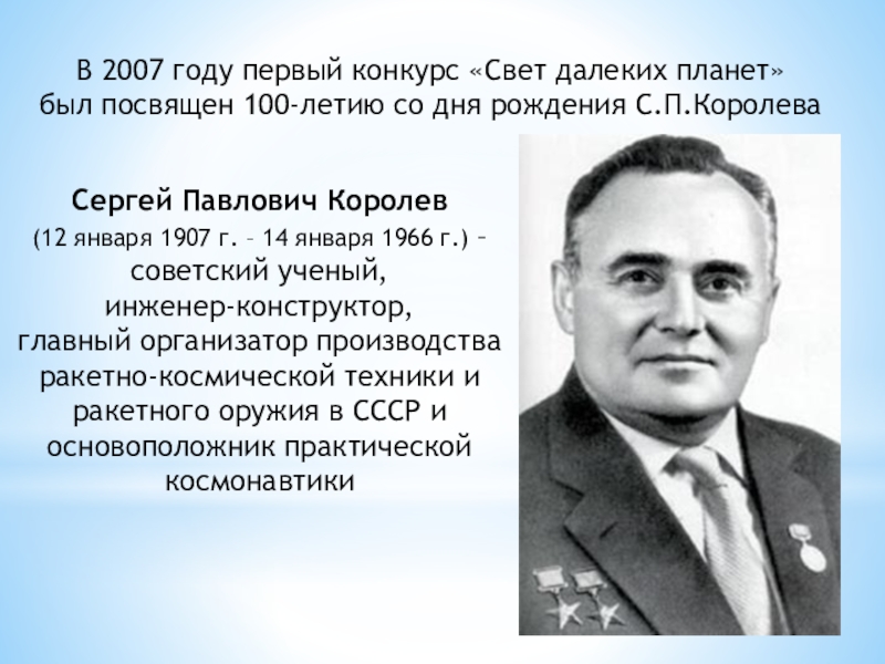 главный организатор производства ракетно-космической техники и ракетного оружия в СССР и основоположник практической космонавтики