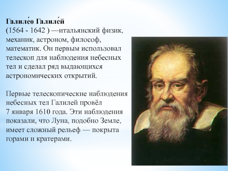Галиле́о Галиле́й  (1564 - 1642 ) —итальянский физик, механик, астроном, философ, математик. Он первым использовал телескоп для наблюдения небесных