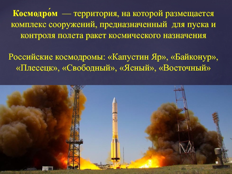 Слайд 18Космодро́м  — территория, на которой размещается комплекс сооружений, предназначенный для пуска и