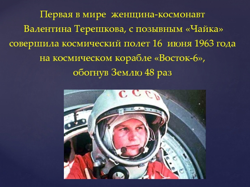 Слайд 14Первая в мире женщина-космонавт
