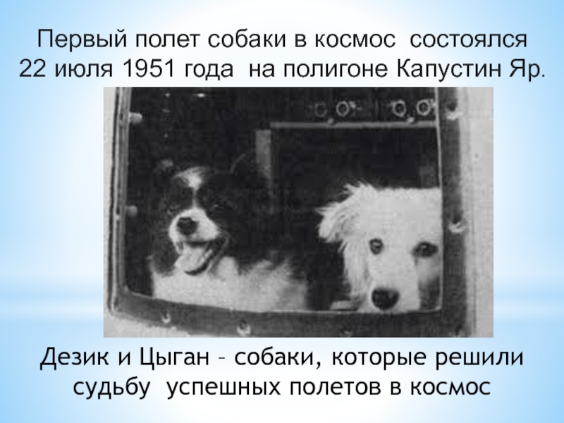 Первый полет собаки в космос состоялся22 июля 1951 года на полигоне Капустин Яр. Дезик и Цыган