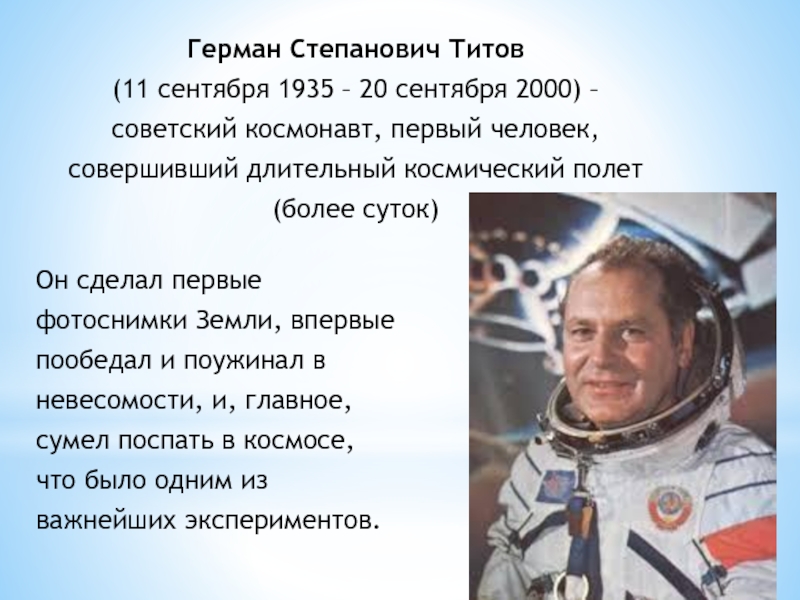советский космонавт, первый человек, совершивший длительный космический полет (более суток)