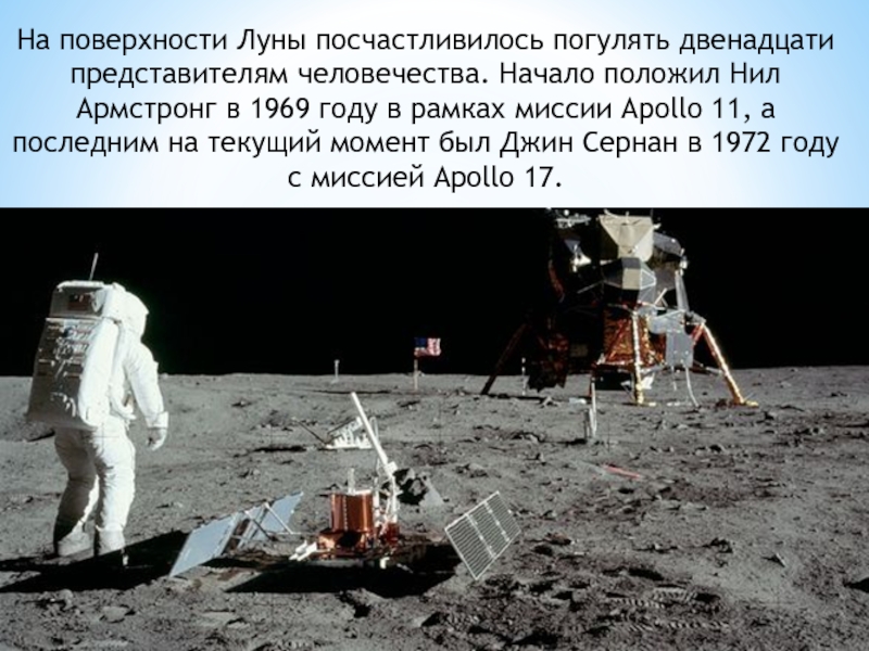 Армстронг в 1969 году в рамках миссии Apollo 11, а последним на текущий момент был Джин Сернан в 1972 году с миссией Apollo 17.