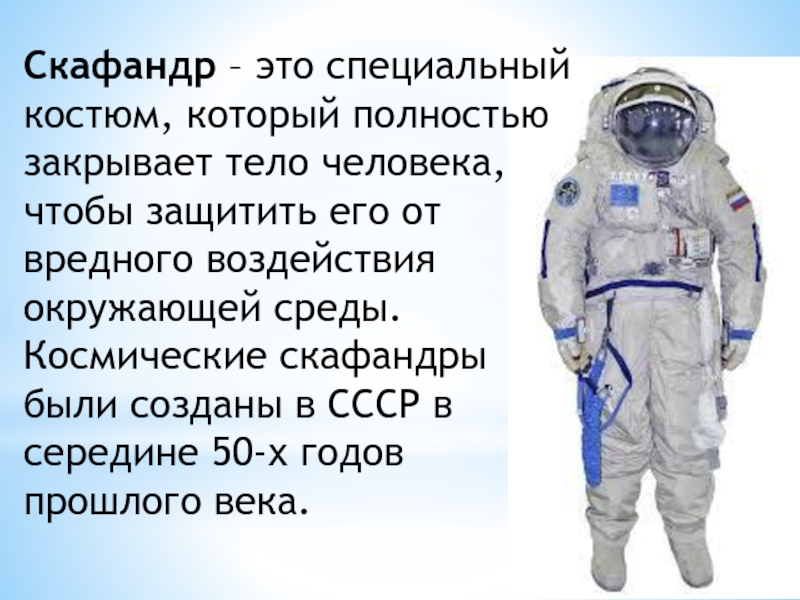 Слайд 7Скафандр – это специальный костюм, который полностью закрывает тело человека, чтобы защитить