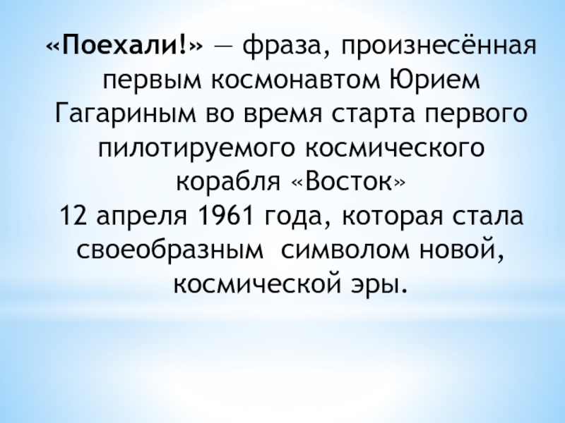 «Поехали!» — фраза, произнесённая первым космонавтом Юрием Гагариным во время старта первого пилотируемого космического корабля «Восток» 12 апреля