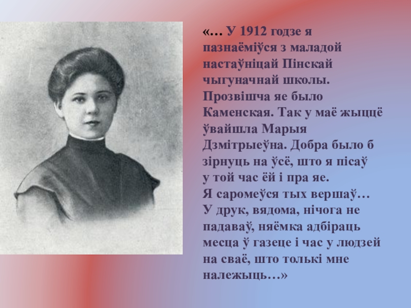 школы. Прозвішча яе было Каменская. Так у маё жыццё ўвайшла Марыя Дзмітрыеўна. Добра было б зірнуць на ўсё, што я пісаў у той час ёй і пра яе. Я саромеўся тых вершаў… У друк, вядома, нічога не падаваў, няёмка адбіраць месца ў газеце і час у людзей на сваё, што толькі мне належыць…»