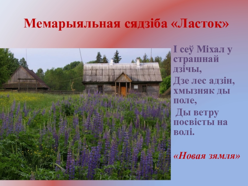 Мемарыяльная сядзіба «Ласток»І сеў Міхал у страшнай дзічы, Дзе лес адзін, хмызняк ды поле, Ды ветру посвісты