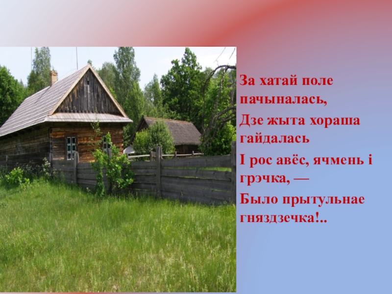 За хатай поле пачыналась, Дзе жыта хораша гайдалась І рос авёс, ячмень і грэчка, — Было прытульнае