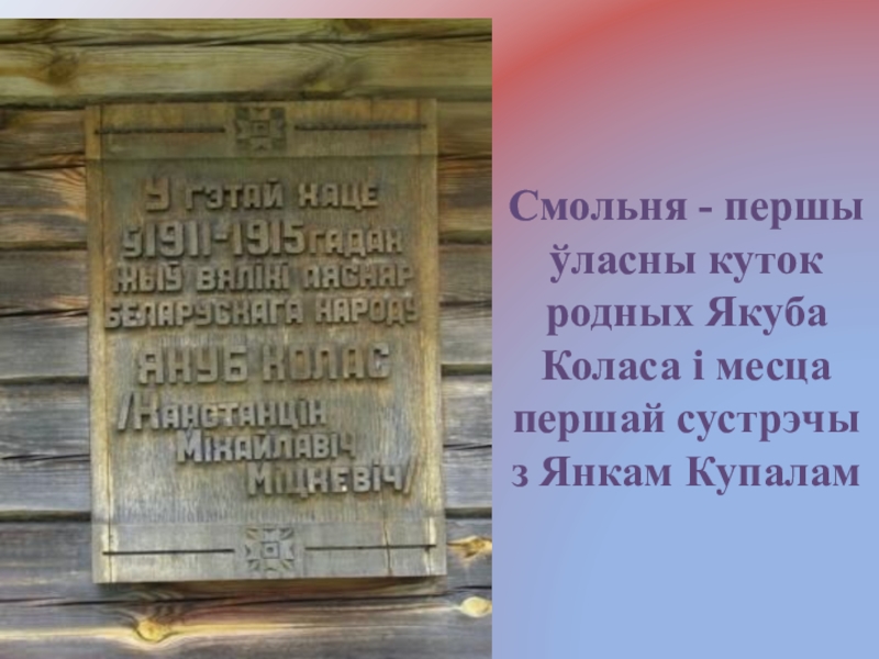 Слайд 20Смольня - першы ўласны куток родных Якуба Коласа і месца першай
