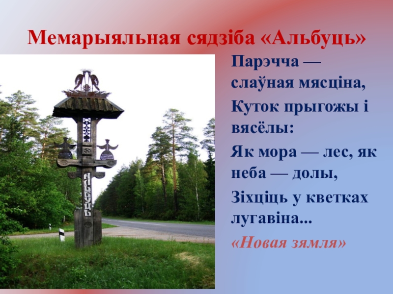 Мемарыяльная сядзіба «Альбуць»Парэчча — слаўная мясціна,Куток прыгожы і вясёлы:Як мора — лес, як неба — долы,Зіхціць у