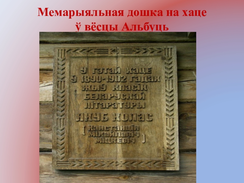 Слайд 14Мемарыяльная дошка на хаце ў вёсцы Альбуць