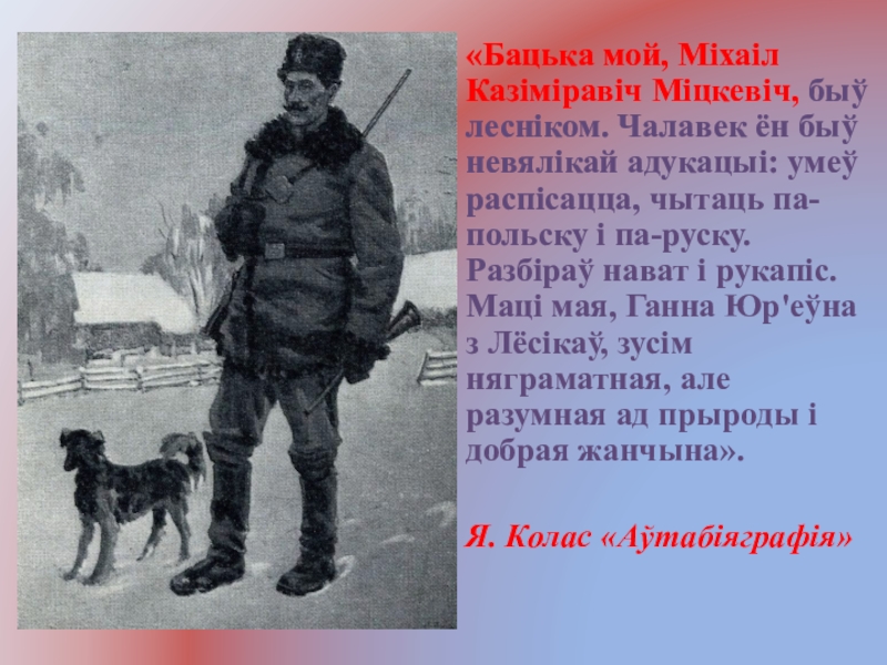 Слайд 6«Бацька мой, Міхаіл Казіміравіч Міцкевіч, быў лесніком. Чалавек ён быў невялікай