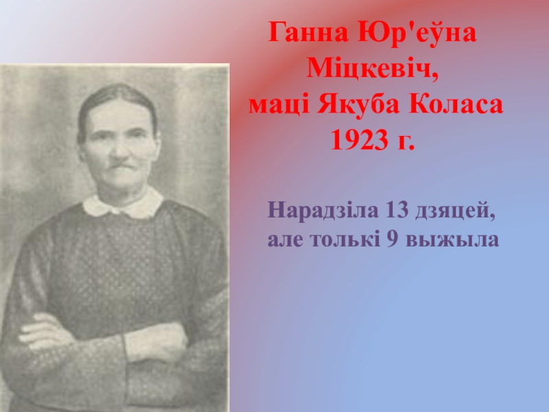 Слайд 7Ганна Юр'еўна Міцкевіч, маці Якуба Коласа 1923 г.