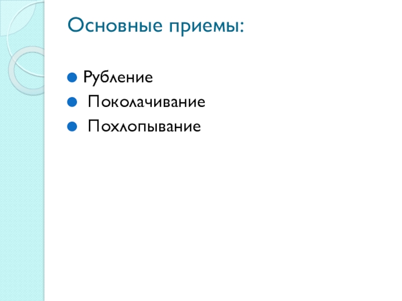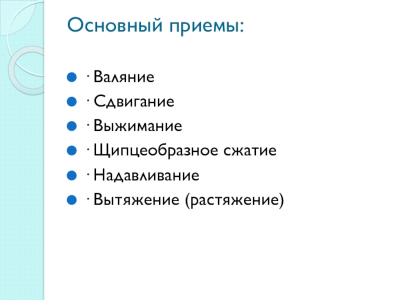 Основный приемы: · Валяние · Сдвигание · Выжимание · Щипцеобразное сжатие · Надавливание· Вытяжение (растяжение)