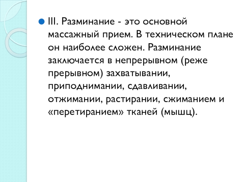 III. Разминание - это основной массажный прием. В техническом плане он наиболее сложен. Разминание заключается в непрерывном