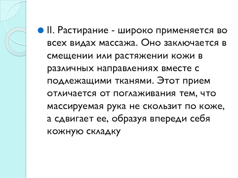 Слайд 7II. Растирание - широко применяется во всех видах массажа. Оно заключается