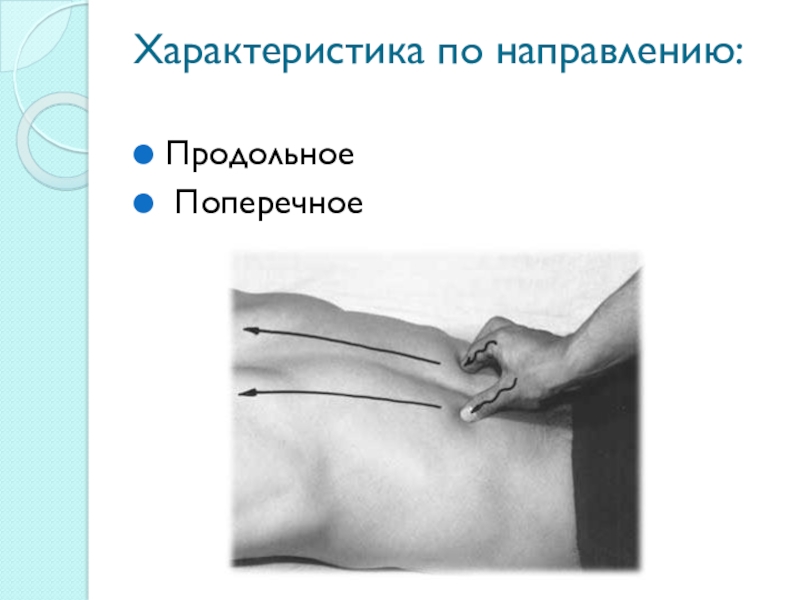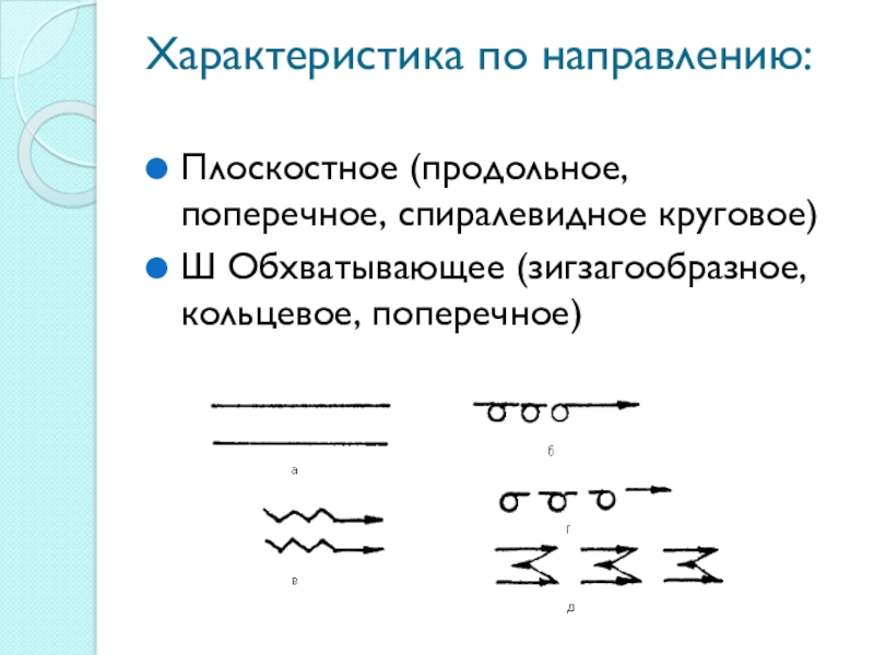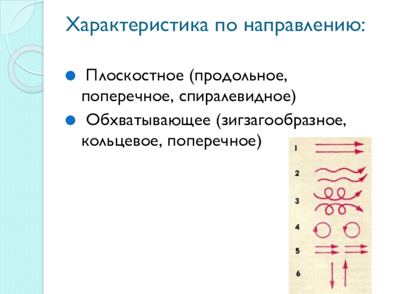 Характеристика по направлению: Плоскостное (продольное, поперечное, спиралевидное круговое)Ш Обхватывающее (зигзагообразное, кольцевое, поперечное)