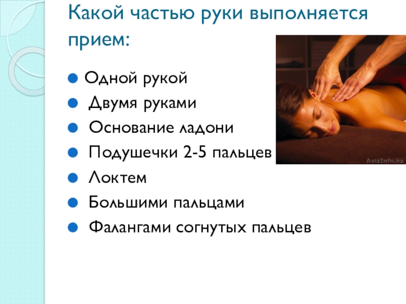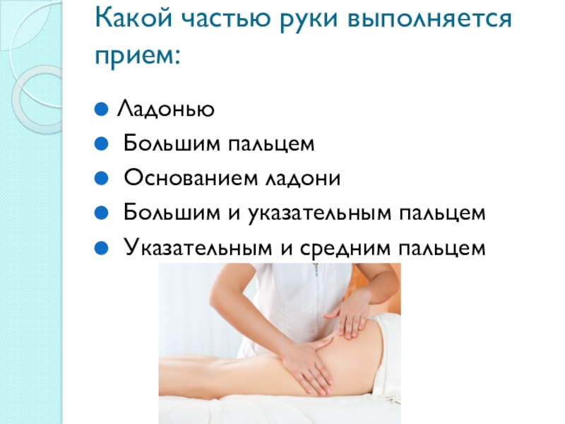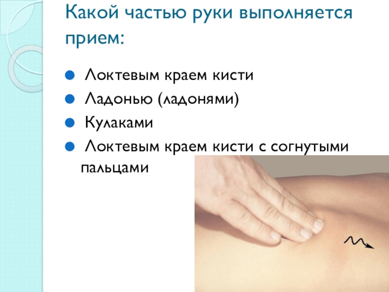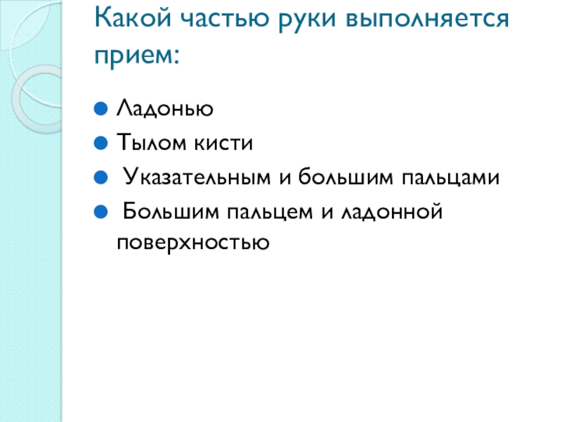 Какой частью руки выполняется прием: Одной рукой Двумя руками Основание ладони Подушечки 2-5 пальцев Локтем Большими пальцами