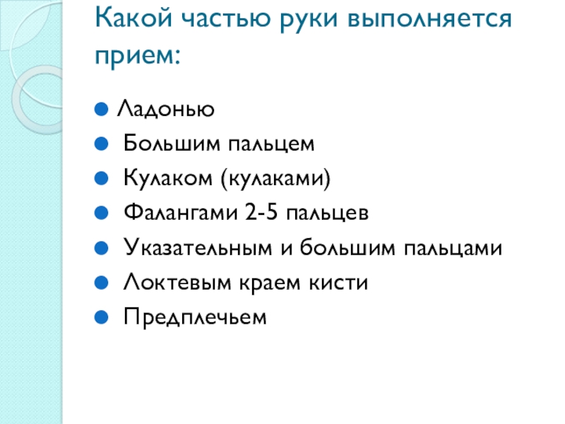Какой частью руки выполняется прием: Ладонью Большим пальцем Кулаком (кулаками) Фалангами 2-5 пальцев Указательным и большим пальцами