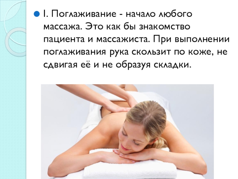Слайд 3I. Поглаживание - начало любого массажа. Это как бы знакомство пациента