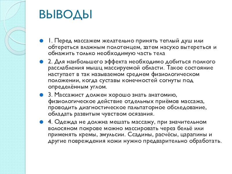 ВЫВОДЫ 1. Перед массажем желательно принять теплый душ или обтереться влажным полотенцем, затем насухо вытереться и обнажить