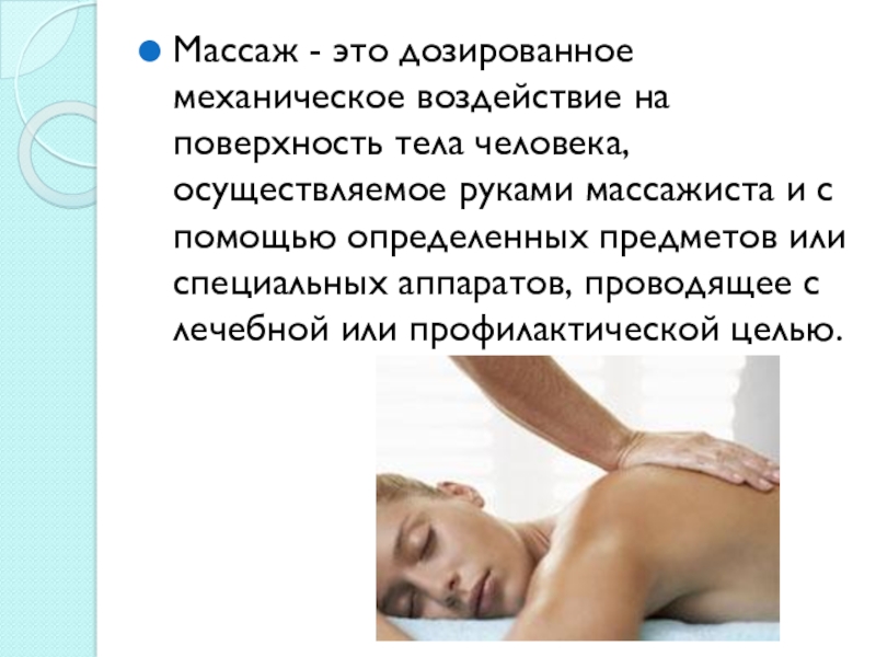 Массаж - это дозированное механическое воздействие на поверхность тела человека, осуществляемое руками массажиста и с помощью определенных предметов или специальных аппаратов, проводящее с лечебной или профилактической целью.
