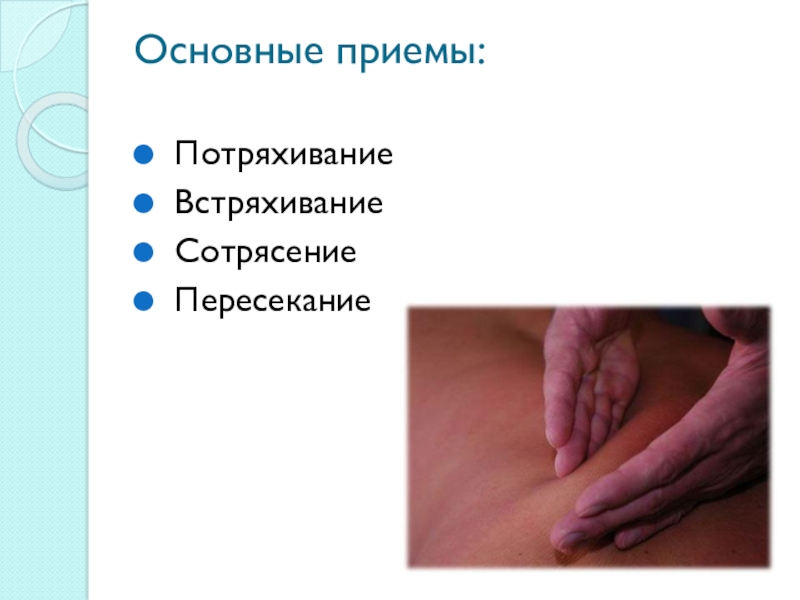 Основные приемы:  Потряхивание Встряхивание Сотрясение Пересекание