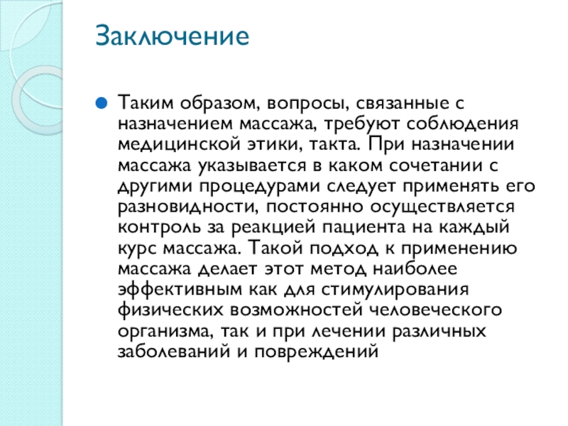 Заключение Таким образом, вопросы, связанные с назначением массажа, требуют соблюдения медицинской этики, такта. При назначении массажа указывается