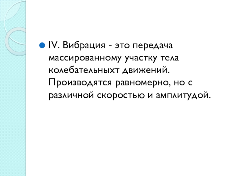 IV. Вибрация - это передача массированному участку тела колебательныхт движений. Производятся равномерно, но с различной скоростью и