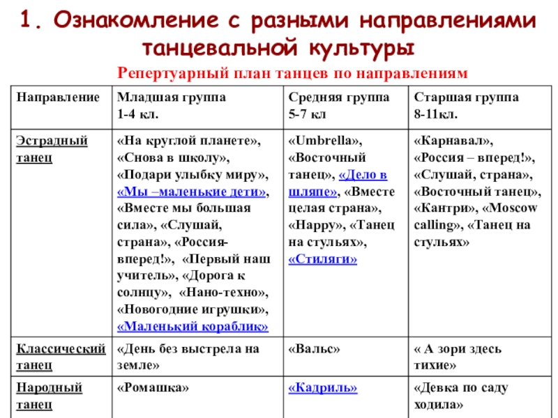 Познакомить учащихся с разными направлениями танцевальной культуры