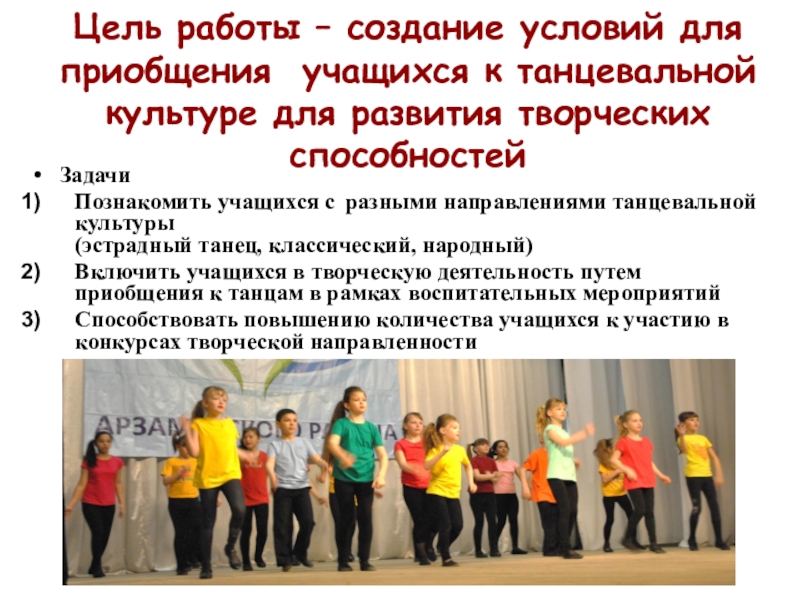Включить учащихся в творческую деятельность путем приобщения к танцам в рамках воспитательных мероприятий