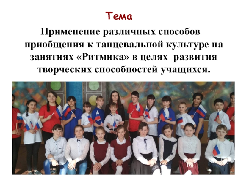 Танцевальная культура присутствует в учебной деятельности лишь в начальных классах в рамках уроков музыки. Двигательная музыкальная активность, способствующая развитию творчества детей, в урочной деятельности практически не развивается