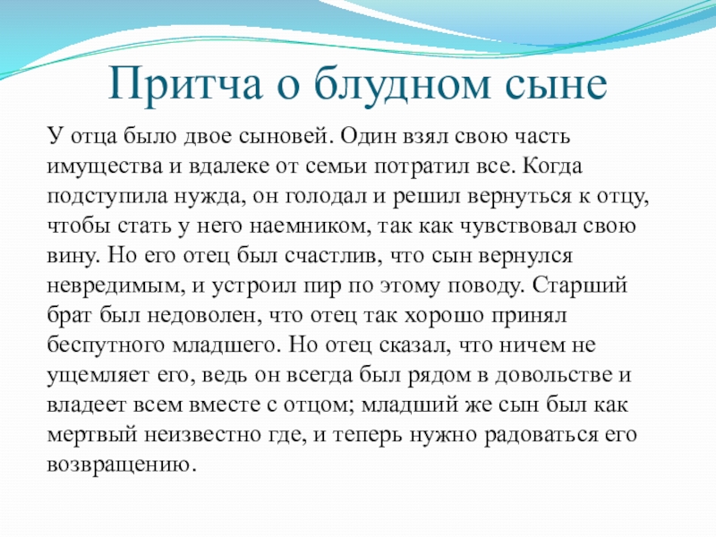 Притча о блудном сыне У отца было двое сыновей. Один взял свою часть имущества и вдалеке от семьи потратил все. Когда подступила нужда, он голодал и решил вернуться к отцу, чтобы стать у него наемником, так