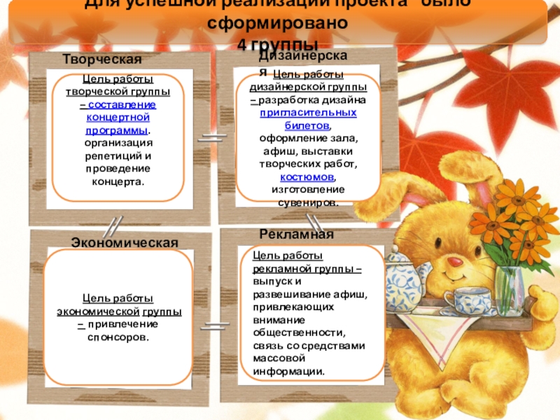 Цель работы дизайнерской группы – разработка дизайна пригласительных билетов, оформление зала, афиш, выставки творческих работ, костюмов, изготовление сувениров.