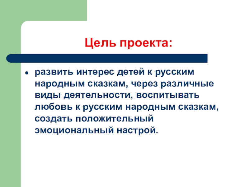 Цель проекта:развить интерес детей к русским народным сказкам, через различные виды деятельности, воспитывать любовь к русским народным