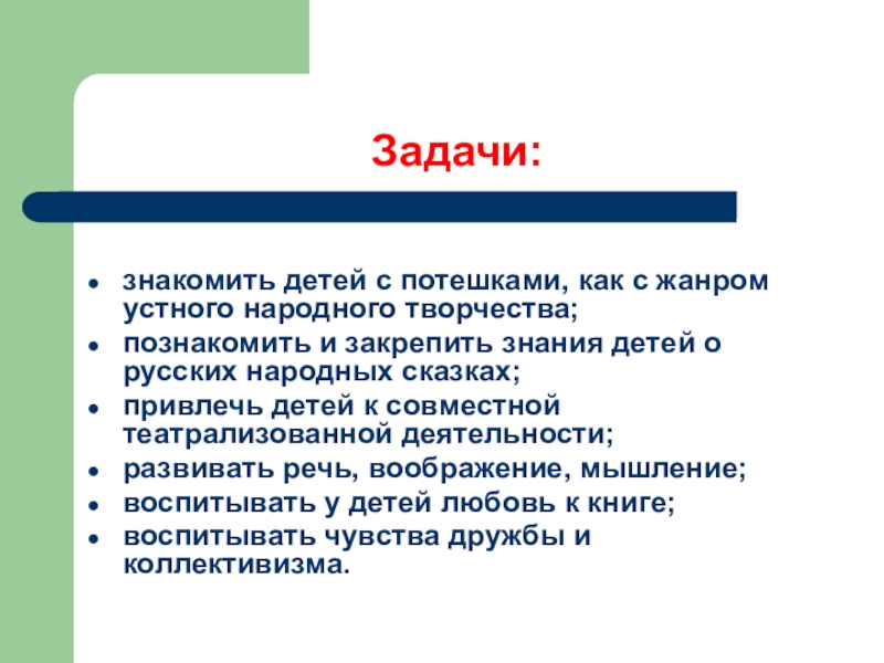 Задачи:знакомить детей с потешками, как с жанром устного народного творчества;познакомить и закрепить знания детей о русских народных