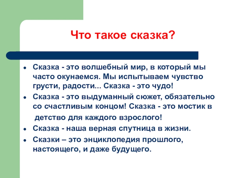 Что такое сказка? Сказка - это волшебный мир, в который мы часто окунаемся. Мы испытываем чувство грусти, радости... Сказка - это чудо!Сказка - это выдуманный сюжет, обязательно со счастливым концом! Сказка - это мостик в