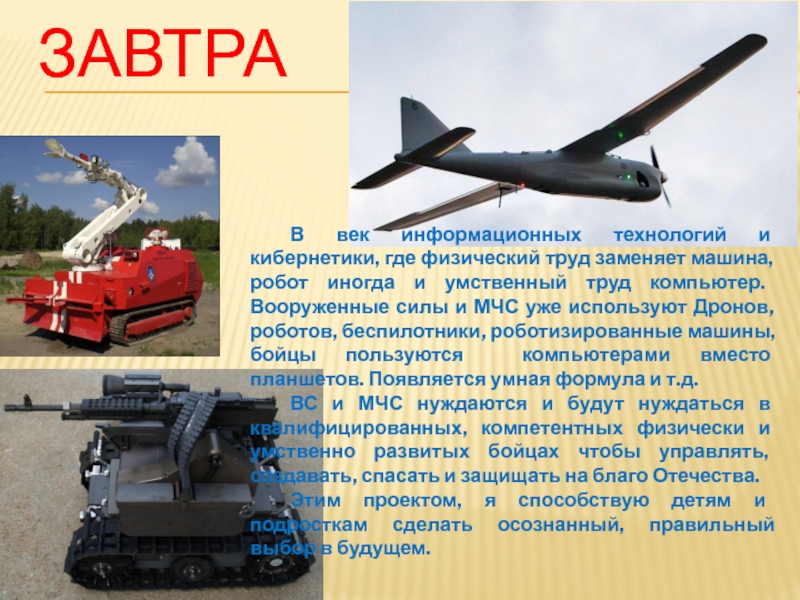 робот иногда и умственный труд компьютер. Вооруженные силы и МЧС уже используют Дронов, роботов, беспилотники, роботизированные машины, бойцы пользуются компьютерами вместо планшетов. Появляется умная формула и т.д.
