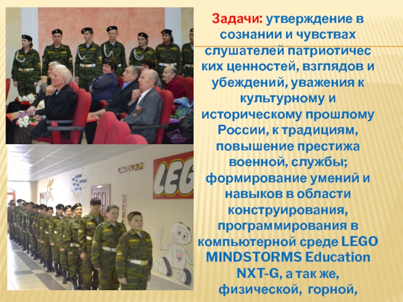 уважения к культурному и историческому прошлому России, к традициям, повышение престижа военной, службы; формирование умений и навыков в области конструирования, программирования в компьютерной среде LEGO MINDSTORMS Education NXT-G, а так же, физической, горной, подготовки.