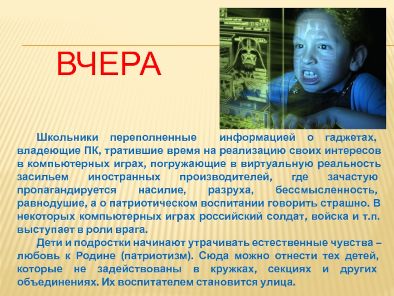своих интересов в компьютерных играх, погружающие в виртуальную реальность засильем иностранных производителей, где зачастую пропагандируется насилие, разруха, бессмысленность, равнодушие, а о патриотическом воспитании говорить страшно. В некоторых компьютерных играх российский солдат, войска и т.п. выступает в роли врага.