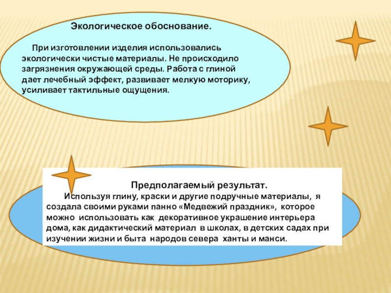 При изготовлении изделия использовались экологически чистые материалы. Не происходило загрязнения окружающей среды. Работа с глиной дает лечебный эффект, развивает мелкую моторику, усиливает тактильные ощущения.