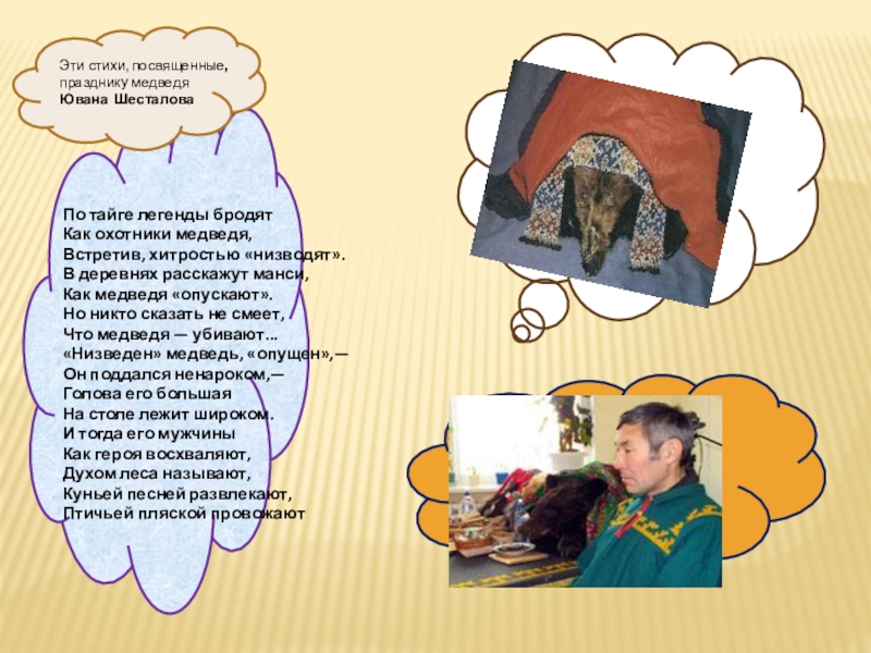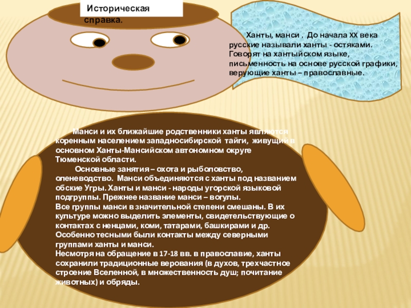 Ханты, манси . До начала XX века русские называли ханты - остяками. Говорят на хантыйском языке, письменность на основе русской графики, верующие ханты – православные.