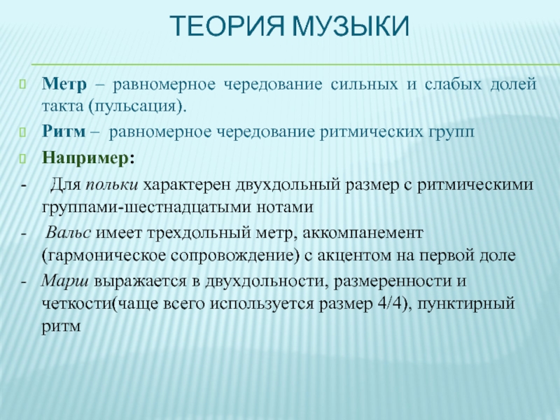 Метр – равномерное чередование сильных и слабых долей такта (пульсация).