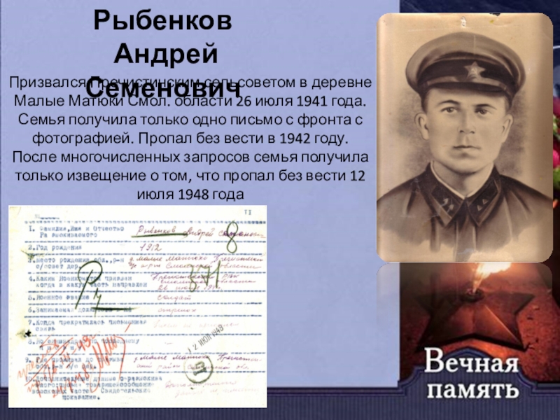 После многочисленных запросов семья получила только извещение о том, что пропал без вести 12 июля 1948 года