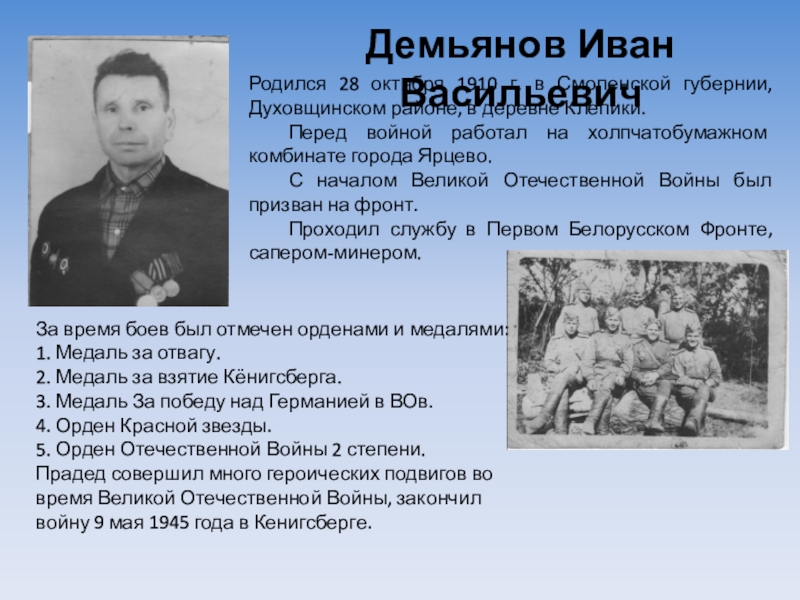 Прадед совершил много героических подвигов во время Великой Отечественной Войны, закончил войну 9 мая 1945 года в Кенигсберге.